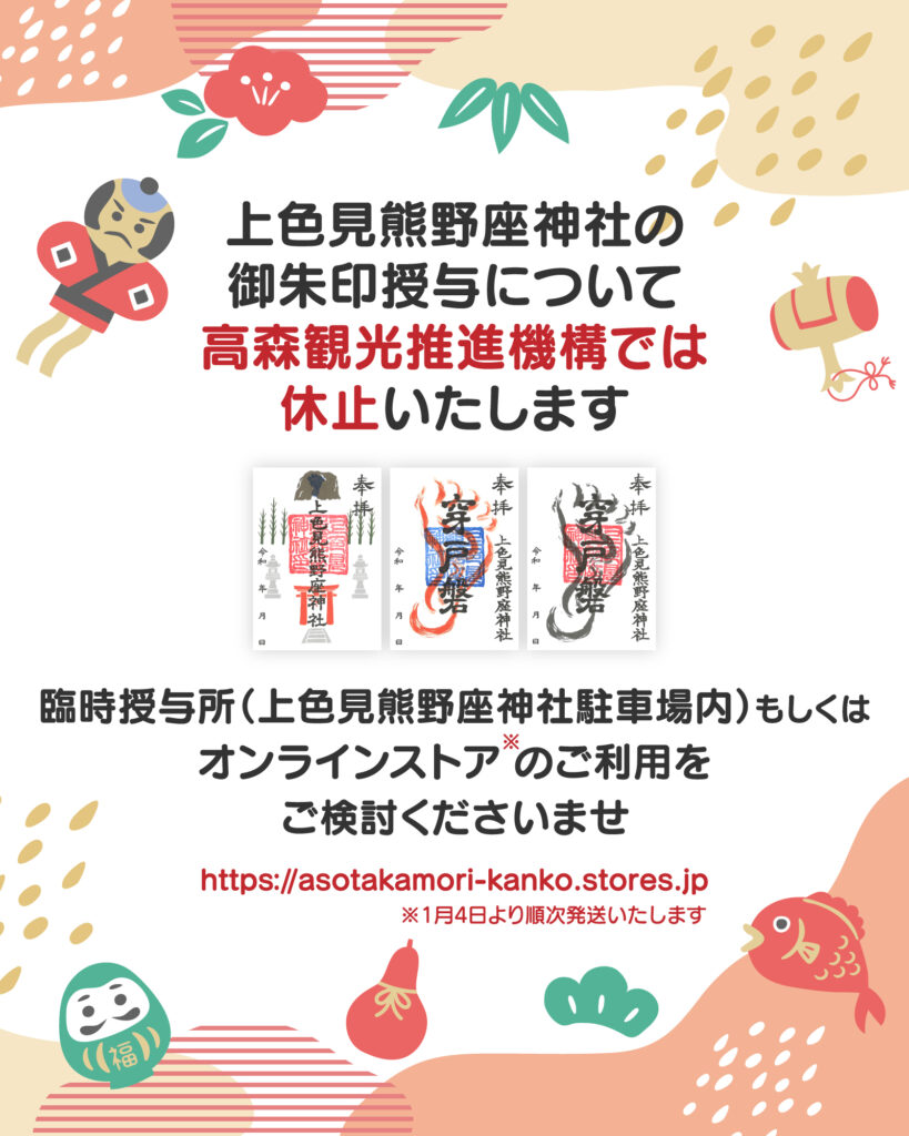 機構での上色見熊野座神社の御朱印授与も休止いたしますので、
