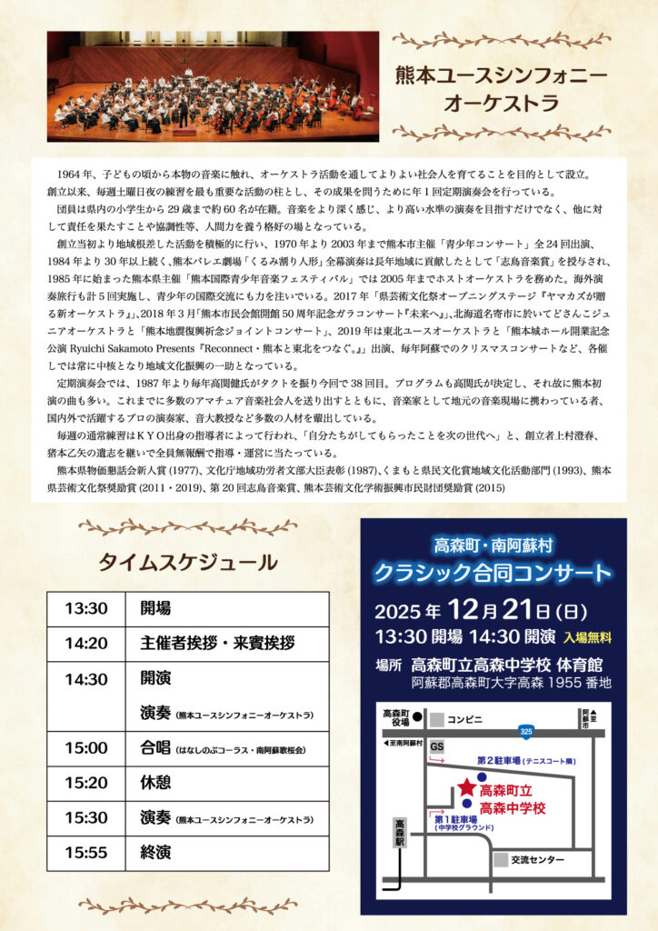 熊本ユースシンフォニーオーケストラをお招きし、高森町と南阿蘇村合同開催のクラシックコンサートを開催します。
