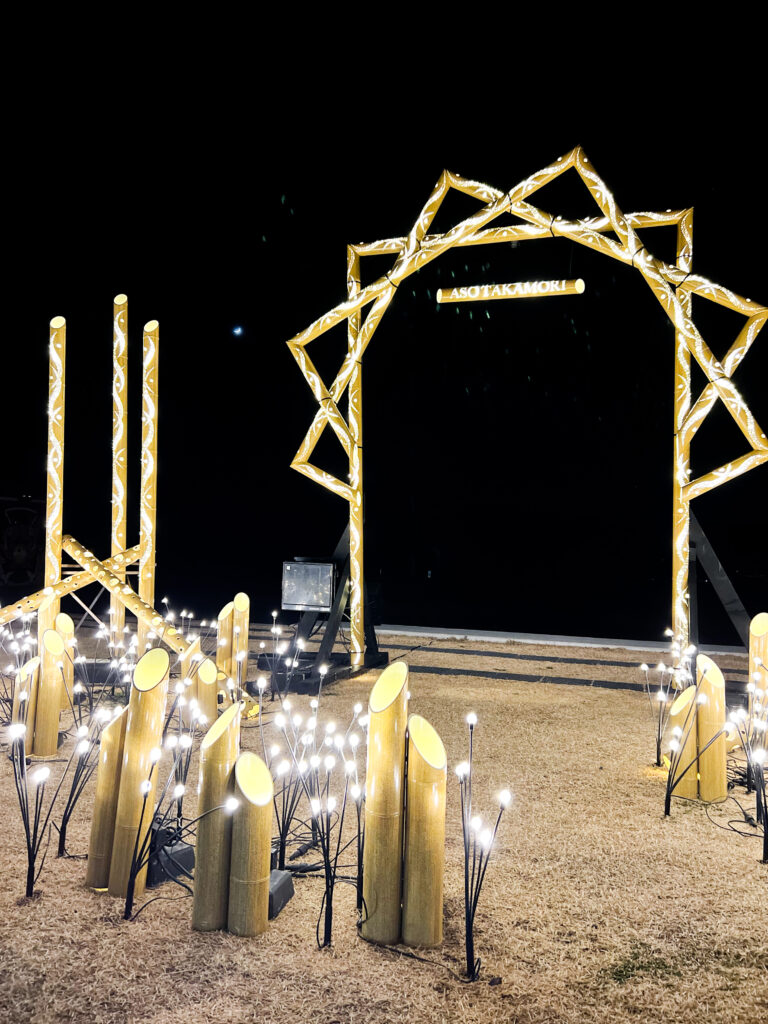 阿蘇の外輪山に落ちる夕日や根子岳をモチーフとした『竹あかり』のフォトスポットを芝生広場のメインに配置し、高森駅の回廊等にも町をイメージしたイルミネーションを施しました。
